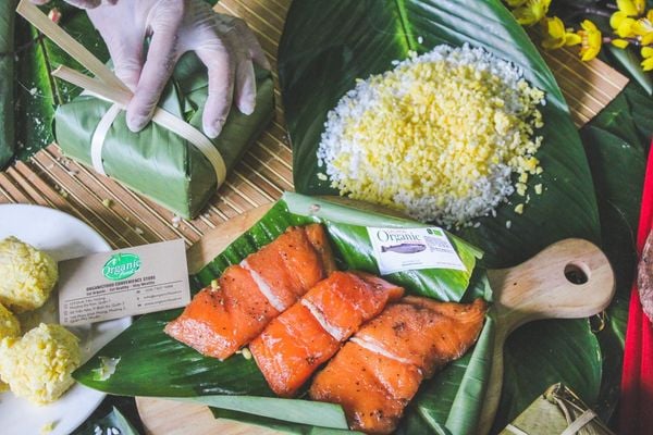 Bánh chưng nhân Cá Hồi: Làn gió mới cho mâm cỗ Tết với nhân cá hồi organic tươi ngon, giàu Omega-3, vị lạ miệng nhưng cực kỳ cuốn hút.