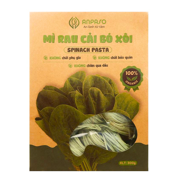 Mì rau củ là một trong những lựa chọn ưu tiên của các chị em nội chợ cho các sản phẩm mì khô để cung cấp chất dinh dưỡng và bữa ăn tiện lợi cho gia đình mình. Mì cải bó xôi Anpaso Organic gói 300g là một trong những sản phẩm đáp ứng các điều kiện tìm kiếm của người dùng. Cải bố xôi được gieo trồng hữu cơ theo tiêu chuẩn Organic, cùng công thức bí truyền và sự cố vấn chuyên môn của chuyên gia Nhật.