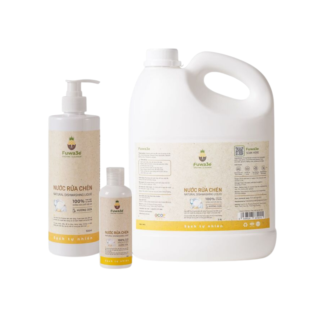 Khác với nước rửa chén công nghiệp dùng hoạt chất hóa học để tẩy rửa, Fuwa3e sử dụng 90% là chế phẩm Enzyme sinh học được ngâm ủ và lên men từ vỏ dứa (thơm), vỏ cam, chanh...
